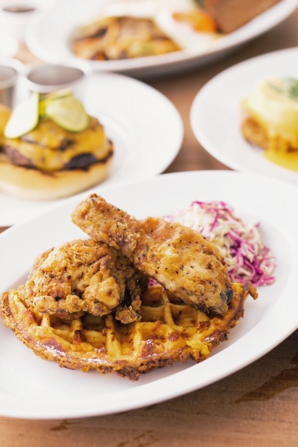 数あるメニューの中でも特に気になるのが「バターミルクフライドチキン」(税別1,680円)。2008年のオープン当初から存在する人気No.1の看板メニュー! 数多くのメディアやブログに取り上げられ、そのおいしさは、この味を求めてマンハッタンの食通も通うほどだとか。ジューシーなフライドチキンとチェダーチーズワッフルのコンビネーションはもちろん、横に添えられたシロップを自分の好きなようにかけて、味の変化も楽しめます。