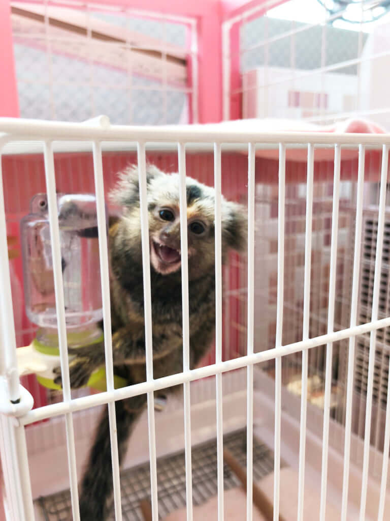 ピグミーコモンマーモセットは、小さくて賢いおサルさん。このサイズからは大きくならないので、ペットとしてもじわじわと人気が出ているそう。まだまだ人見知りはしていますが、人懐っこい女の子です。慣れるまではケージの中にいるそうですが、いつか抱っこできるかも?!