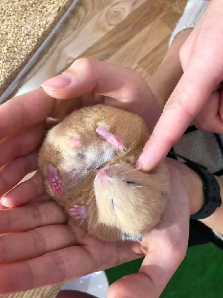 頬袋にえさを詰め込んで、まんまる姿が可愛いハムスターくん。手のひらの上でリラックスして寝てしまう子も♪ お仲間に上に乗っかられても、構わずお昼寝する姿に萌えまくり♡ ゴールデンハムスターとキンクマの2種類がいます。