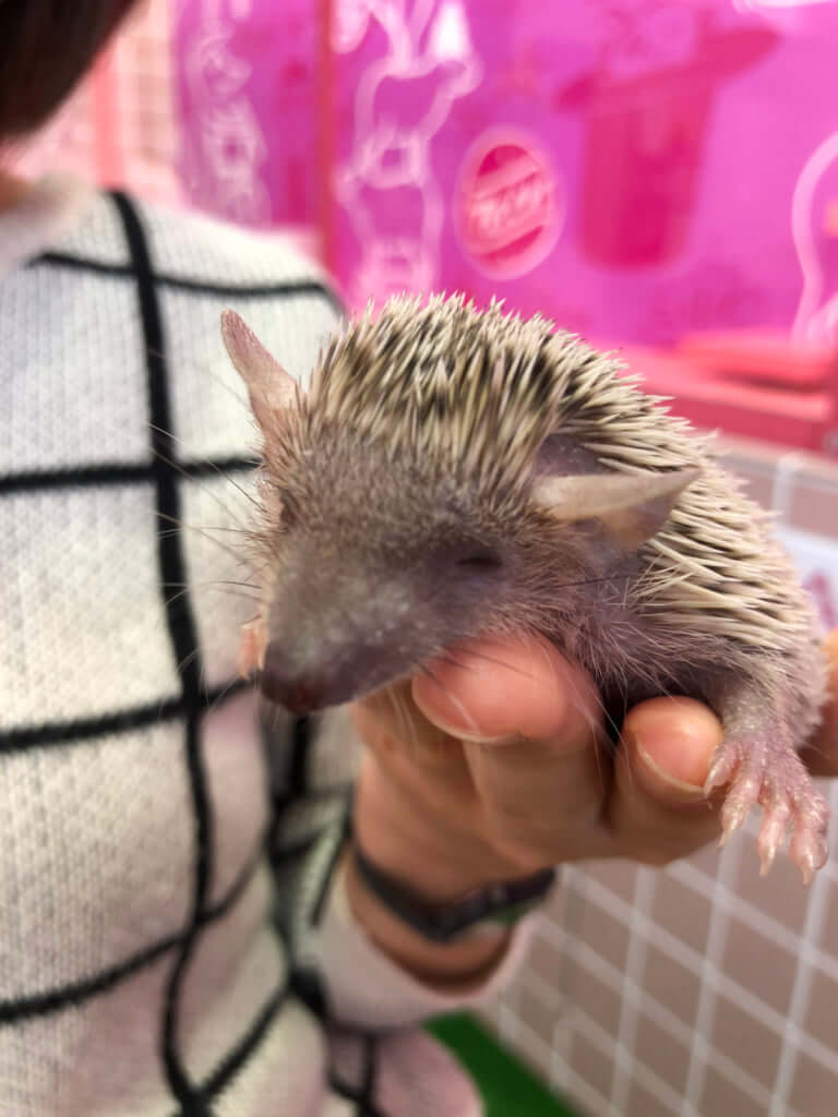 ハリネズミのようなヒメハリテンレックは、とてもおとなしくてのんびり屋さん。めったに毛を逆立てたりしないので、抱っこもできます。触ると毛が固くちょっと尖っていて、つぶらな瞳がかわいい動物さんです。優しくそっと触ってくださいね。