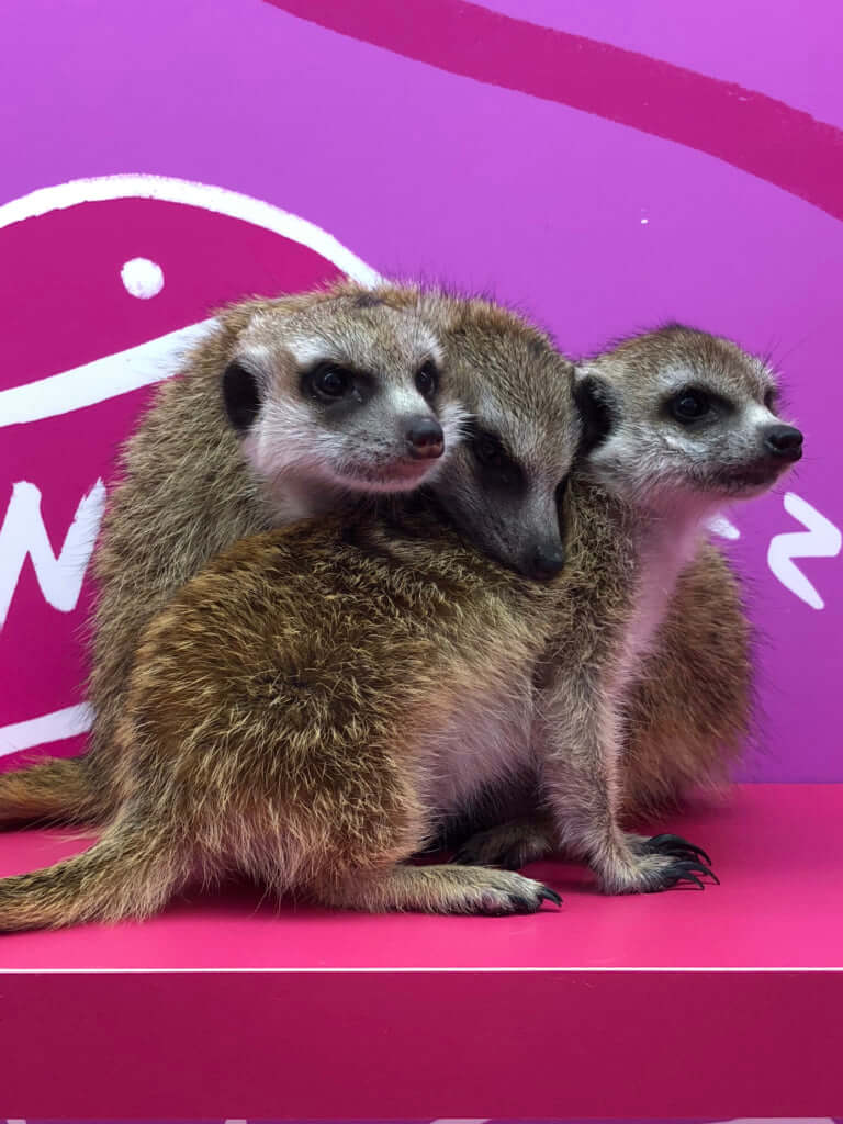前足を上げてきょろきょろ見回す姿が有名なミーアキャット。とても社交的な動物で、仲間たちとじゃれ合ったり毛づくろいをし合う姿は愛嬌たっぷり。人にも懐いて、おとなしく抱っこをさせてくれます。
