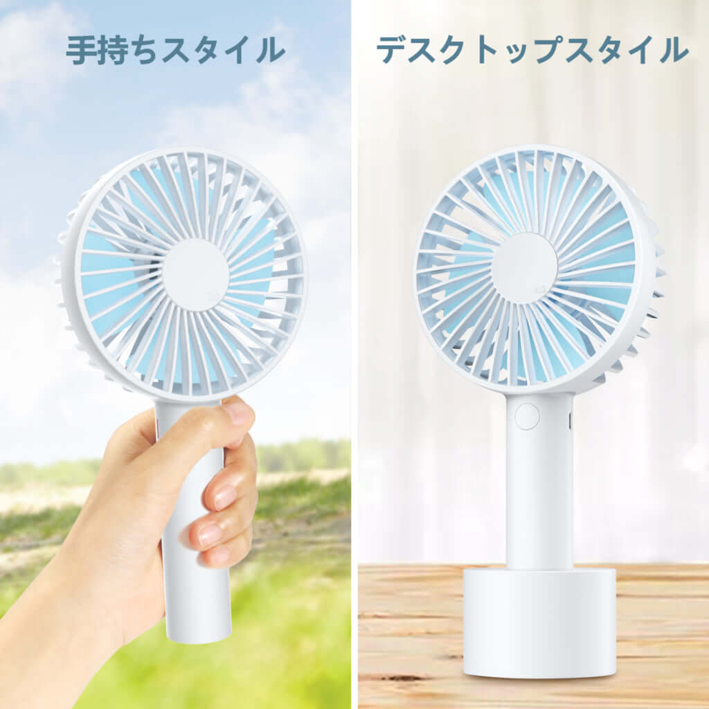 手持ちタイプとしてだけでなく、専用スタンドも付いているので、デスクトップ型としても活用できます♪ 使う場所を選ばないシンプルなデザインは、自分のお部屋やお仕事場で活躍間違いなし! ファンの大きさが直径10cmと手持ち扇風機の中ではやや大きめなので、デスク上でも風をしっかり感じることができます♪
