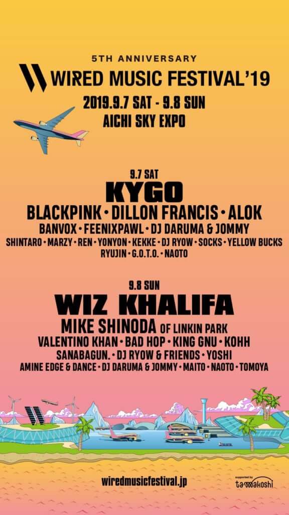 大人気の「WIRED MUSIC FESTIVAL’19 」が9/7(土)、8(日)に愛知県国際展示場で2daysに渡って開催されます。注目は、BIGBANGも所属するYGエンターテインメントによって結成された人気ガールズグループ「BLACKPINK(ブラックピンク)」♡ カリスマ性のある音楽で世界中から人気を集めるBLACKPINKをはじめ、トロピカルハウスのトップスターKygo(カイゴ)、アメリカを一世風靡するラッパーのWiz Khalifa(ウィズ・カリファ)など有名アーティストが多数出演!