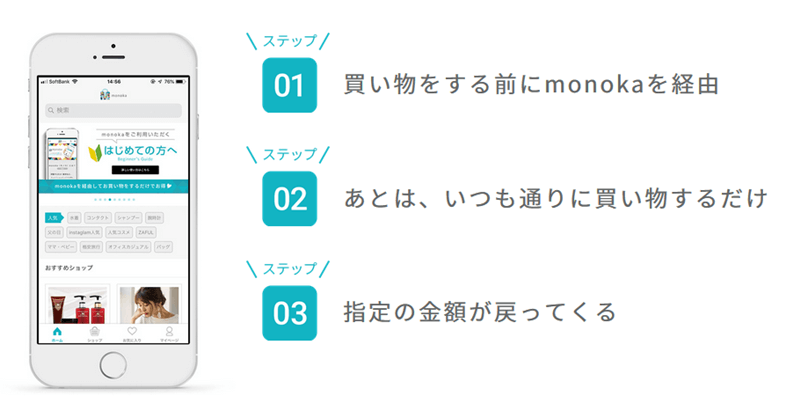 今ドキ女子にはもはや定番のネットショッピング。コスメや洋服のお買物や、旅行の予約など色々なサービスをスマホやパソコンから手軽にオーダーしてませんか?もしあなたが普通にサイトからお買物していたら…、すっごくもったいない! 注目のショピングサイト「monoka(モノカ)」を使ってお気に入りのショップでお買い物すれば、なんと現金のキャッシュバックが受け取れる神的サービスがあるのです♡