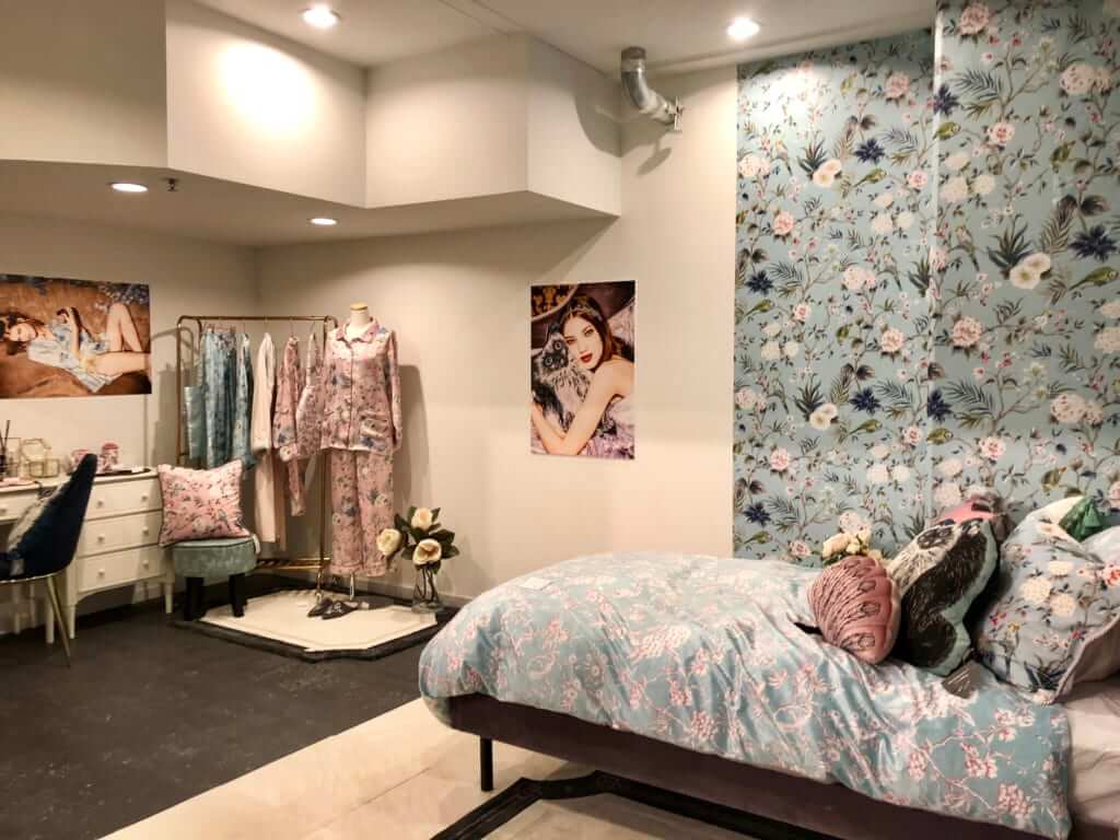 花柄が基調になったアイテムのほか、サテンやベロア、ジャカード織りの質感がグラマラスなムードを漂わせるグッズが揃います。猫や扇子をかたどった、遊び心あふれるクッションはインテリアのハズしに使っても◎。