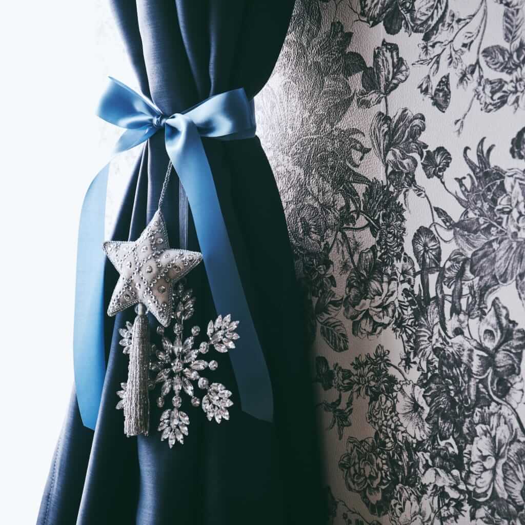 カーテンタッセルの代わりにオーナメントを飾るお手軽アレンジ! カーテンのデザインに合わせて、定期的にデザインを変えて楽しむこともできます。