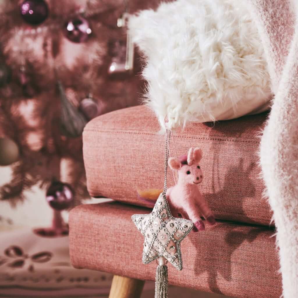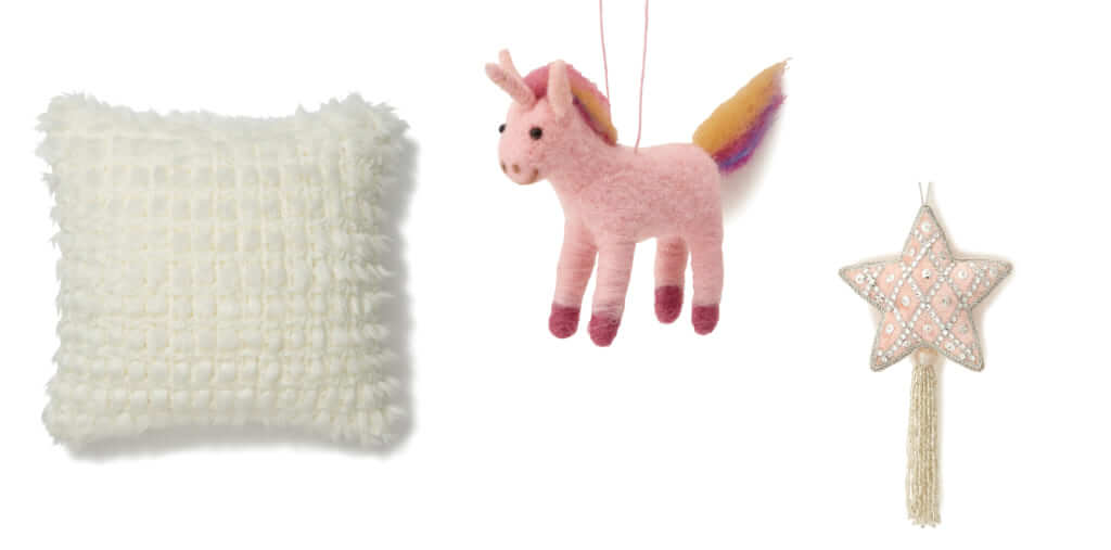 左から、「ルステア クッションカバー ホワイト」3,500(税込)、「ファブリックオーナメント ユニコーン」800円(税込)、「エンブロイダリー オーナメント タッセル スター ピンク」1,200円(税込)