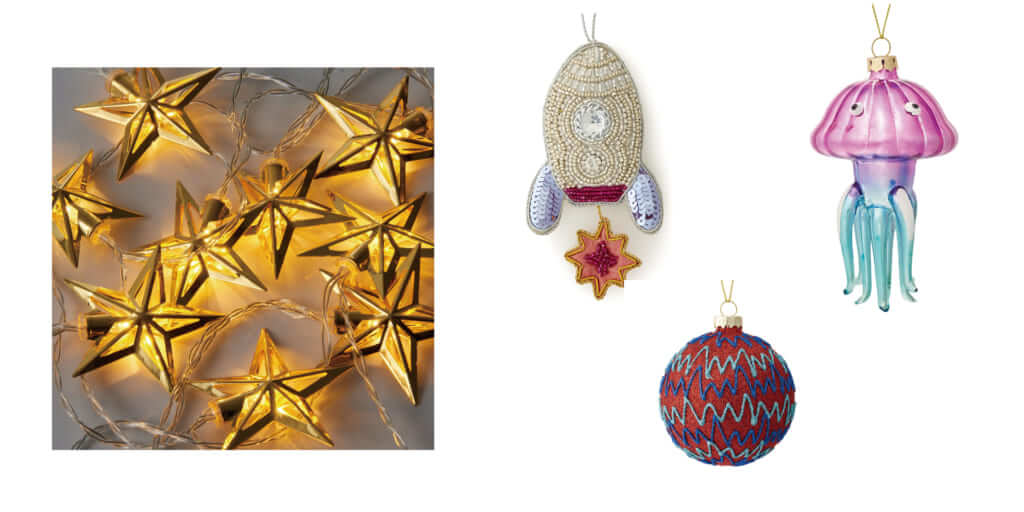 左から、「LEDガーランド スター ゴールド」1,800円(税込)、「ビーズ オーナメント ロケット シルバー」800(税込)、「ガラス オーナメント グリッター&ライン レッド」500円(税込)、「ガラス オーナメント ジェリーフィッシュ ミックス」1,200円(税込)
