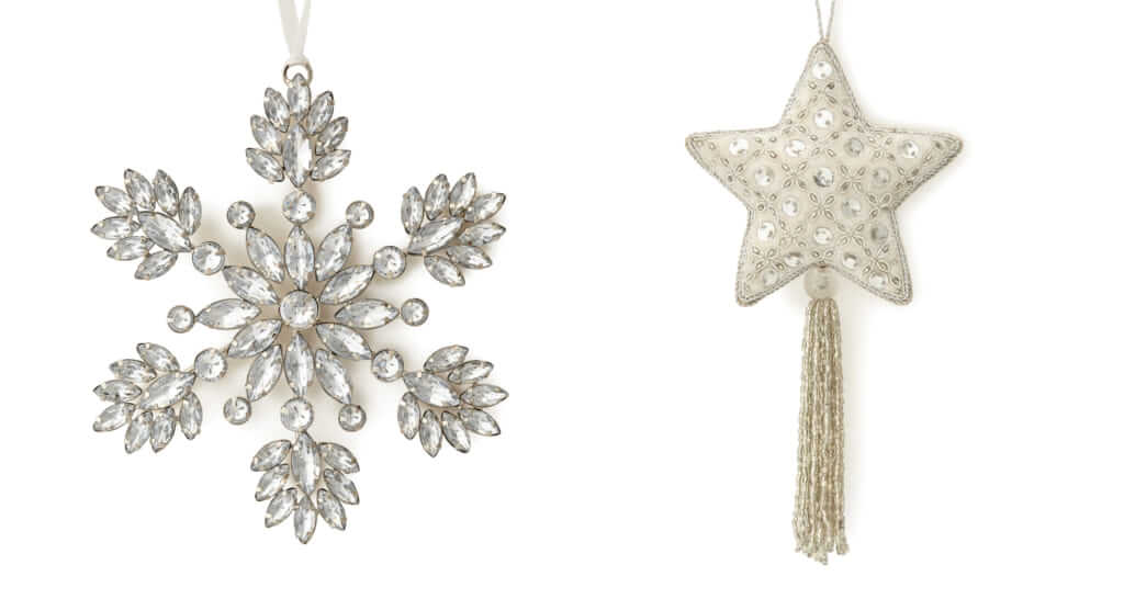 左から、「スノーフレーク オーナメント シルバー」1,200(税込)、「エンブロイダリー オーナメント タッセル スター ホワイト」1,200円(税込)
