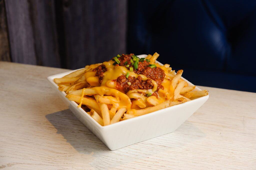 トロトロのチェダーチーズを加えて、アツアツのポテトフライにかけた「チリチーズフライ」。