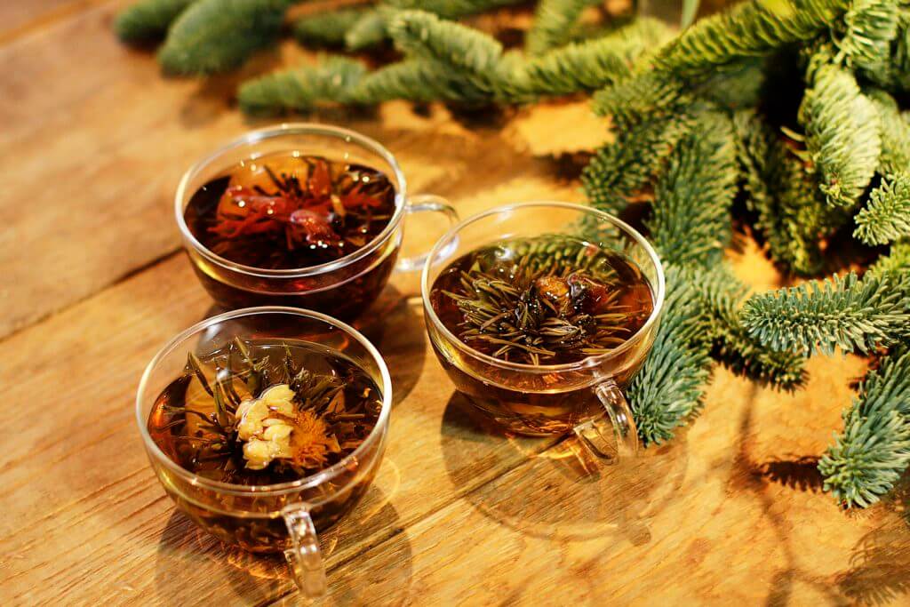 ⽩ワインベースの桜⾹る「桜のサングリア」、お湯を⼊れるとゆっくりと蕾が花咲く⾒て楽しむ花のお茶