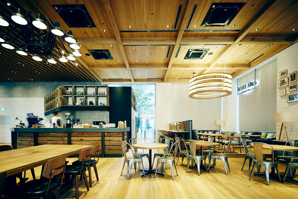 周囲は静かなオフィス街で、渋谷の繁華街からも少し離れた場所にある「café 1886 at Bosch」。広々とした店内は、天井が高くとっても開放的。ウッドテイスト調のデザインになっていて、木の落ち着きと温かみのある空間でゆっくりくつろげる雰囲気です。また、電源・Wi-Fiが設置されているので、スマホの充電もでき、仕事の資料作成や勉強など、作業をしたいときにもぴったりです!