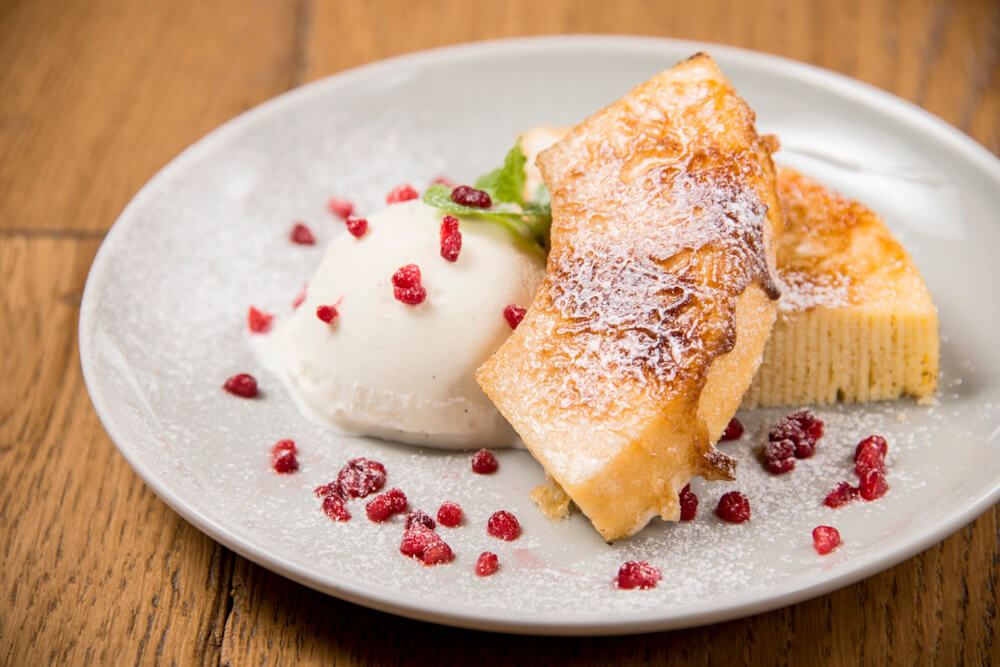 季節ごとに変わる、美味しくてフォトジェニックなスイーツも楽しめます! 写真は、こうばしくキャラメリゼした、食感もパリパリのバウムクーヘンにバニラアイスがトッピングされた「バウムクーヘン ブリュレ バニラアイス添え」。カフェタイムにおすすめの一品です♪