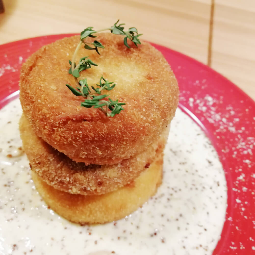 そんな貴重なじゃがいもを、3種の異なるテイストのコロッケにしてタワーのように3段重ねました。上段は、一晩寝かせた牛煮込みがまろやかな味付けで牛肉の味が存分に楽しめ、中段は、トマトソースの酸味が効いたイタリアン風味。下段は、まろやかなチーズとコーン入りのコロッケで、1つひとつの味が全く違うので最後まで飽きることなくいただけます。粒マスタード入りのホワイトソースも丁度良いアクセントになっていました。