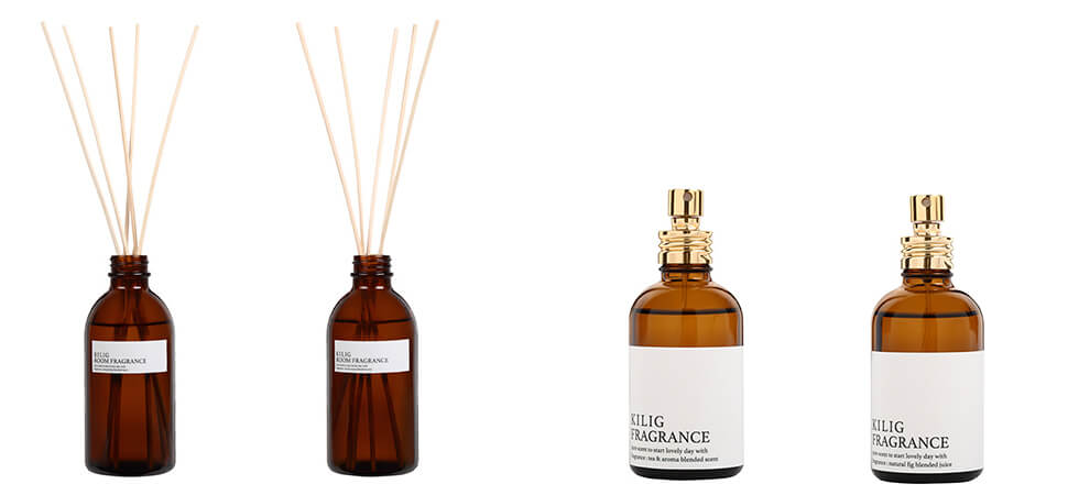 左から「キリグ ルームフレグランス 200mL<ティー&アロマブレンドセント>/<ナチュラルフィグブレンドジュース>」 各3,400円(税抜) 「キリグ フレグランススプレー 60mL<ティー&アロマブレンドセント>/<ナチュラルフィグブレンドジュース>」 各2,800円(税抜)