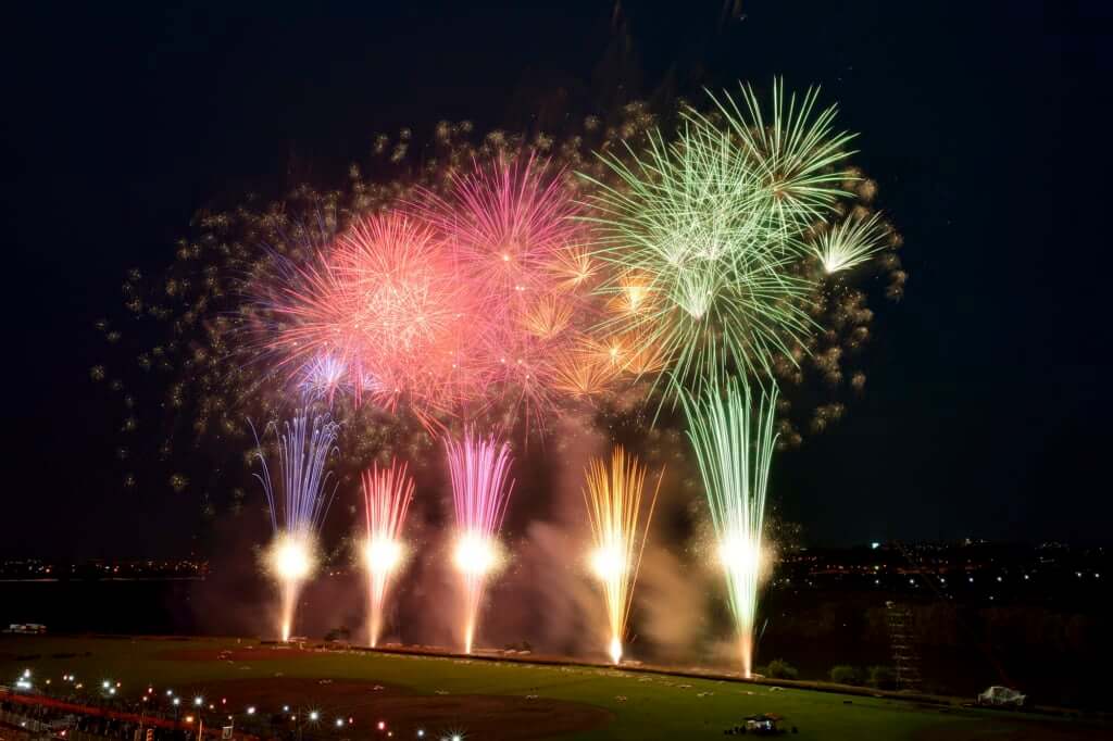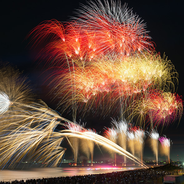 この大会の花火の打ち上げ総数はなんと2万3000発! 国内最大級の花火大会です。海上花火もあり、幕張の海岸を彩る大パノラマの花火は圧巻! 観覧席の声で花火が打ち上がる観客参加型のプログラムのほか、グランドフィナーレでは約1万発を超える特大ミュージックスターマインや銀一色の大空中ナイアガラも登場します。